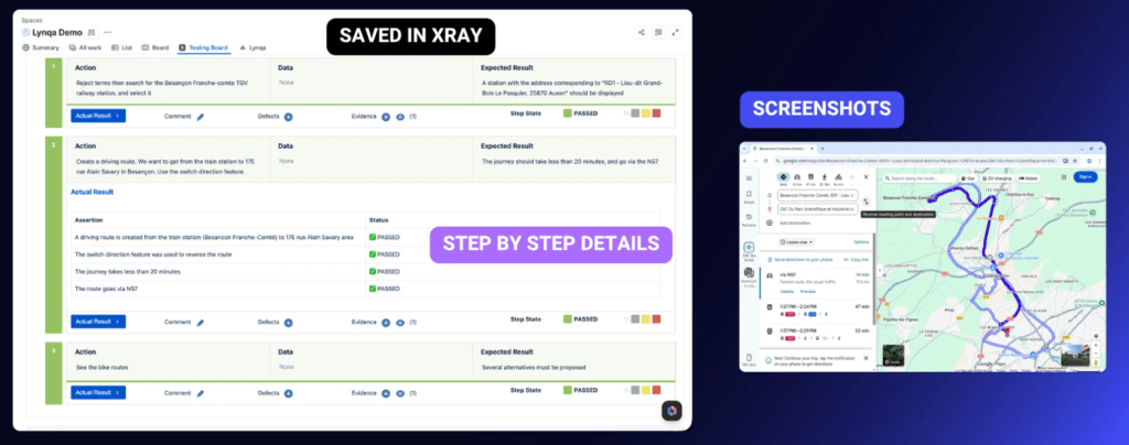 Voici un exemple de visualisation d’une étape de test avec capture d’écran remontée par l’agent IA Lynqa dans Xray :