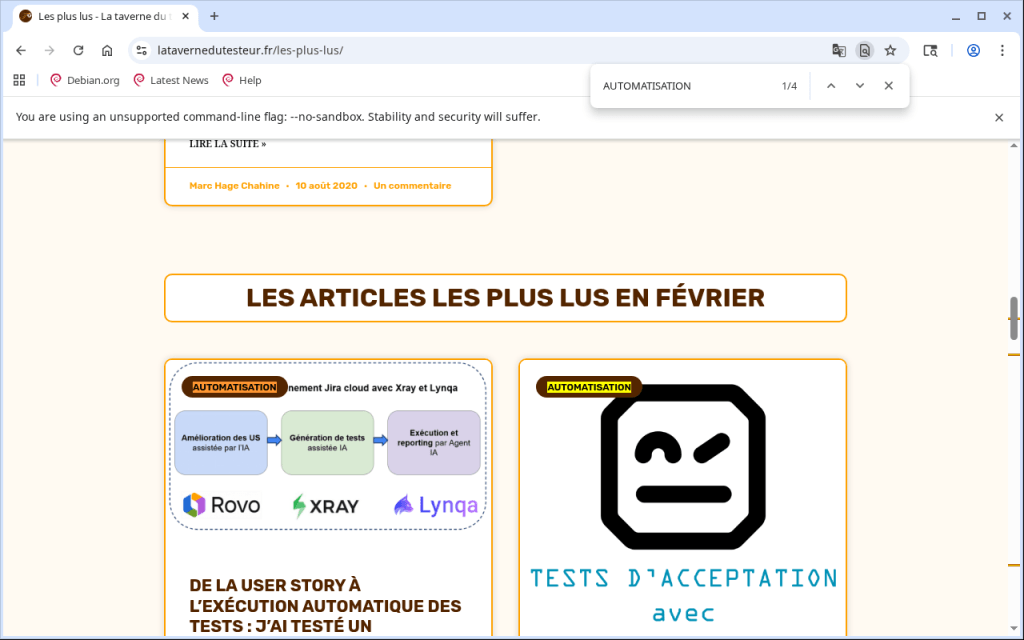 Voici un extrait de dialogue et d’acquisition de connaissances sur un cas de test, volontairement imparfait, portant sur la section « Les plus lus » du site La Taverne du testeur.