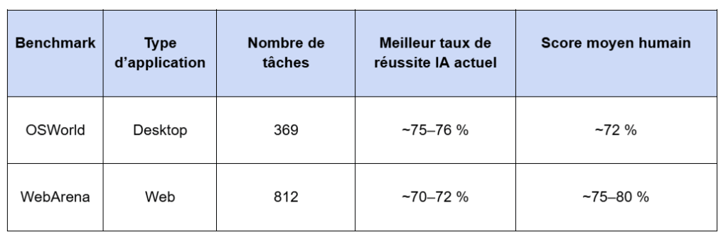 Le plus proche, et le plus utile pour situer l’état de l’art, est la famille des benchmarks dits computer-use, qui évaluent la capacité d’agents IA généralistes à interagir de manière autonome avec des applications, comme le ferait un utilisateur.