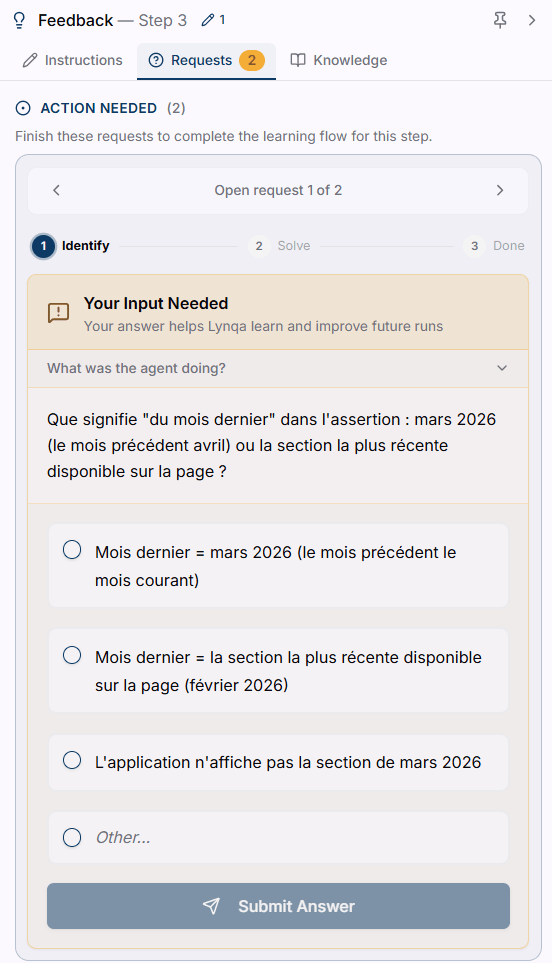 La réponse à ce second problème s’appuie sur la capacité de l’agent à ouvrir le dialogue avec le testeur QA et à apprendre de ce dialogue. Un agent de confiance doit savoir détecter lorsqu’il doute et solliciter l’humain lorsque l’interprétation n’est pas suffisamment sûre.